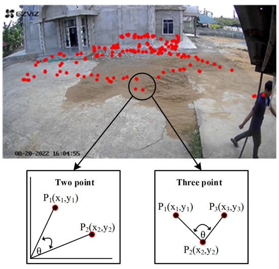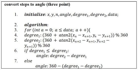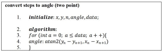 Loitering events are highly dependent not only on the position of the human object in a particular frame, referred to as spatial information, but also on the specific time duration the object appears, defined as temporal information. Therefore, we propose both pieces of information as a novel feature for loitering detection, defined as spatial-temporal features. These features were obtained by calculating the angle at each step. Then, the resulting steps in the video frame are converted into angles. The angle is from to . The visualization of the point in the step converted into an angle is shown in Figure 10. In this research, the angle is obtained from two or three points. The definition of the tangent of an angle between two points is , or . This means that returns the angle between the two locations that constitute the coordinates base of the axis. Figure 11 shows the algorithm for finding the angles originating from two points. Then, the angle obtained from the three points makes the second angle or axis, , and as the endpoint. The algorithm for calculating angles at three points is shown in Figure 12.