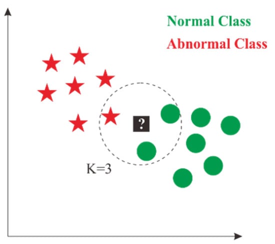 The k-nearest neighbor (KNN) approach classifies objects based on the learning data nearest to the database. KNN is a supervised classification technique in which input data are labeled before training. This technique is utilized frequently in pattern recognition [,] and image processing []. The data will be projected onto multidimensional spaces, with each dimension representing a data characteristic. This area is separated into categories based on the classification of learning data, including normal and abnormal. Figure 13 illustrates an example of the KNN approach.