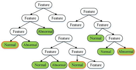 In Figure 14, for instance, there are three trees. Then, every node in the tree represents a property of each class. Two normal classes and one abnormal class are derived from the three trees. Hence, it can be inferred that the random forest approach yields the normal class.
