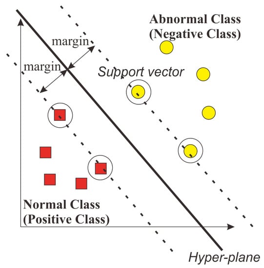 Support vector machine (SVM) is one of the classification techniques commonly employed in supervised learning []. By maximizing the distance between classes, SVM is used to discover the optimal hyperplane. The hyperplane is a function that can be utilized to divide classes. The hyperplane discovered by SVM is depicted in Figure 15. The hyperplane is located between the two classes. The hyperplane should maximize the margin between the support vector from each class, as described in red and yellow circles.