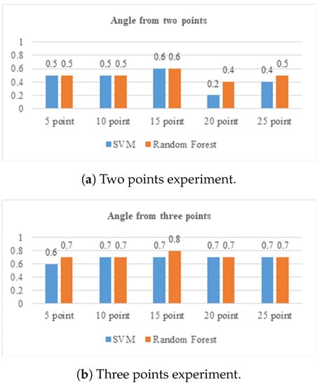 The proposed feature has been modeled in the previous experiment with three popular machine-learning methods. Based on the experimental results, using two points that are converted into angles, the best results are obtained using the SVM and random forest methods. First, the best configuration uses a linear kernel on SVM and a composition of 80 trees on the random forest method. Then, using three points converted to angles, the best results were obtained using the RBF kernel in the SVM method, 60 trees in the random forest method. Therefore, the video data experiment will use this configuration to determine the accuracy of the classification results.