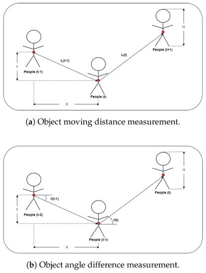 Finally, the proposed method is also compared with other loitering detection methods, namely the method in Jin Su Kim’s research []. The loitering detection method used in Jin Su Kim’s research [] uses two main features, namely the distance between objects moving between frames (Equation (3)) and the angle resulting from the movement of objects between frames (Equation (4)). Figure 17a shows the method for measuring movement distance of the object.