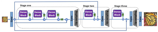 The residual network demonstrates outstanding performance to obtain high-level features from low-level features, especially in SR problems [11,13,15]. Due to improving the performance and computation costs of the residual network, a combination of residual architecture [16] and dense connections [38] under the three-stage progressively upsampling framework is employed. The combination of the multi-level residual network and the dense connections architecture (RRDB) [15,39] is used in the first stage of our progressive framework model. The residual dense block architecture [27] is applied in the second and third stages, while the Batch Normalization (BN) layers are removed [15]. The BN layer uses the mean and variance for normalizing feature maps during the training and testing phases of the model. In the training phase, BN operates based on the mean and variance of every batch, while in the testing phase, BN performs based on the mean and the variance of the whole training dataset [16]. The problems of unpleasant visual artifacts and inconsistent performance have appeared once the statistics of testing and training datasets are different [51]. The simplified structure of the residual block was introduced to tackle unpleasant visual artifacts and maintain stable training of the SR model.