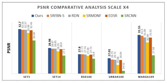 We used the DIV2K dataset [57] to train our SR model. The DIV2K dataset contains 800 high-quality (2K resolution) images used for training purposes. In the testing phase, we compared the performance of our model on five benchmark datasets including Set5 [58], Set14 [59], BSD100 [60], Manga109 [61], and Urban100 [62]. Table 1 represents information regarding the training and testing benchmark dataset in this research.