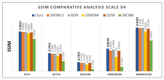 Let us assume and are two patches of GT and reconstructed SR images, respectively. Then, let and be the mean and variance of x, respectively. The covariance of x and y is assumed to be . Therefore, and can be shown as estimates of the luminance and contrast of x, while measures the tendency of x and y to vary together, and define the structural similarity among x and y. According to [46], the luminance, contrast, and structure evaluations are demonstrated as follows: