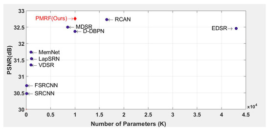 According to this graph, our PMRF model gains the highest PSNR (32.7 dB), and the number of parameters in our model is less than the RCAN [18] model as the second-best PSNR on this scale. Our model with a progressive upsampling framework and the proposed fused objective function archives acceptable trade-offs between accuracy and parameter efficiency.
