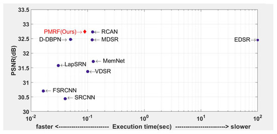 Figure 21 compares the performance and the execution time on the Set5 [58] dataset. According to this graph, our PMRF model gains the highest PSNR (32.7 dB) while its execution time is faster than EDSR [16], RCAN [18], MDSR [16], and MemNet [13].