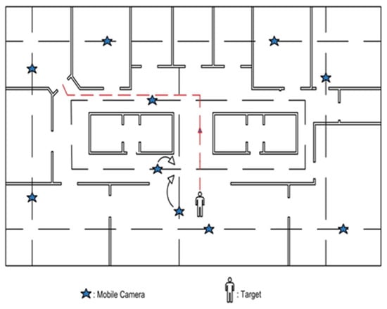 Existing research on this topic focuses on avoiding blind areas [], enhancing detection probability [], or creating routes for mobile cameras []. However, in this paper, cooperative relay tracking between mobile camera sensors is developed by including the prediction of object movement in the tracking process. The primary idea of the relay tracking algorithm is to schedule the mobile camera sensors to follow the target and select the cameras with the shortest moving distance that will follow the target to ensure continuous monitoring of the target. The target movement is based on the Markov Chain Monte Carlo model probability []. Using data mining techniques, we aim to develop an energy-efficient relay tracking algorithm to identify the movement of a target. To conserve energy, only a limited number of cameras will be utilized to monitor a single target. Figure 1 shows a simple scenario of the target and the camera’s movement in a mall. As illustrated in the figure, multiple camera sensors may be used to track any moving object in the mall area.