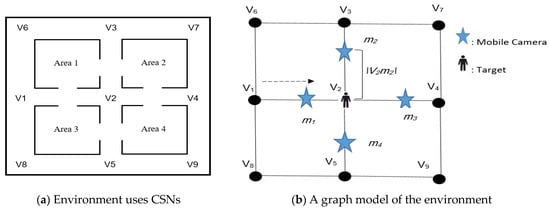 Assume CN mobile camera sensors are deployed randomly in an environment, such as a building or an area composed of streets that intersect with each other. Suppose, as shown in Figure 2a, that a target navigates around some areas in the environment. This situation can be modeled as a graph (G = V, E), where V = {V1, V2, …, Vn} represents the set of vertices in G and E = {E1, E2, …, Em} represents the set of edges, as shown in Figure 2b. Each vertex is an intersection point between two or more paths in the given environment. Every camera has a visual range denoted as v. A tracking camera records the movement distance Td of the target as it travels randomly from vertex to vertex. It is assumed that each camera knows the graph topology and records the target location when the target is within its visual range. As the target moves from one vertex to another, several camera sensors will hold on to the path. Finding the required number of mobile camera sensors in order to reduce the cost of tracking the target is a critical problem in CSNs. Since moving and activating unnecessary camera sensors in order to be ready to track the target will result in consuming some of the energy of these cameras. For example, when the target in Figure 2b moves from V1 to V3, without any kind of cooperative relay tracking mechanism, all three cameras (m2, m3, and m4) will be activated and ready to start tracking the target when it reaches vertex V2. However, in the case of predicting the target’s future direction, only some cameras will be needed to monitor the target, and the other cameras should be set in a sleep state.