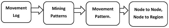 A pattern recognition algorithm attempts to obtain efficient real-time tracking. Using data mining techniques, the objective is to detect any moving target and predict its future path based on previously extracted information []. As shown in Figure 3, the proposed algorithm for pattern recognition has several steps. It begins with a classification method to cluster the sensors into regions, forming a hierarchical model of sensor nodes to log each movement of the object. Then, a data mining algorithm will analyze the logs to construct the movement patterns. We utilize the target’s movement patterns to predict his next location. By dividing the testing area into regions, we can minimize the number of cameras that are active, allowing us to turn on just those cameras that are in the area where the target is located. therefore, saving energy for the remaining cameras. Node-to-node patterns and node-to-region patterns are two types of movement patterns in the network that characterize the target’s movements. An object transfer from node-to-node occurs in the same region, whereas an object transfer from node-to-region occurs in a different region. Because of this, the movement patterns of each sensor node are distinct. As the last step, we calculate the frequency of the derived pattern to determine which one is most likely to be accurate.