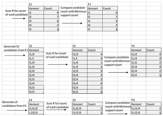 Each item in the first iteration of this method is a member of the set of candidate first item sets, S1. Assume the minimum number of supported counts is two. The set of frequent items P1 is the set of items in S1 with more than two occurrences in R, as shown in Figure 4. The method then executes a join of P1 on P1 to generate the candidate of second items S2, and the set of frequent item sets P2 will be formed by collecting all the items in S2 with a support count larger than 2. This technique is continued until there are no more common k-item sets detected.