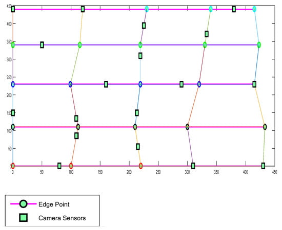 The proposed approach was evaluated using the MATLAB simulation tool. For the purpose of comparison with Ref. [], the same testing environment, which is a square topology, was used. The size of the environment is 450 m × 450 m. A set of camera sensors were deployed randomly in the edges of the testing area. A picture of the simulated environment is shown in Figure 5. The figure could represent a building composed of five floors where each floor has five intersections or an area composed of [5 × 5] streets with an edge length of [80, 120]. Each camera sensor has an initial energy of 200 J. The parameters that were used in the simulation are shown in Table 5.