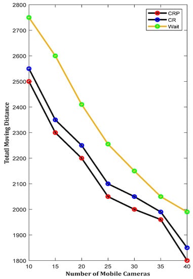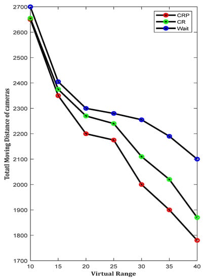 Figure 6 shows the total moving distance of cameras vs. virtual range. When the number of cameras is 20, the visual range increases from 10 m to 40 m, and the target’s total path is 3000 m. As shown in the figure, the overall distance decreases as the visual range increases. This can be justified as when the visual range is high, the distance will be reduced since increasing the value of the visual range will increase the probability of finding the shortest path for each camera. This will result in the overall moving distance of all cameras decreasing. Moreover, the proposed CRP protocol represents a significant improvement compared with the Wait and CR protocols. For example, when the virtual range is 40 m, the moving distance of cameras is 1780 m in the case of the CRP protocol, 1782 m in the case of the CR protocol, and 2100 m in the case of the Wait protocol. This means that the CRP protocol reduces the total moving distance by 5% compared with the CR protocol and by 15.2% compared with the Wait protocol.