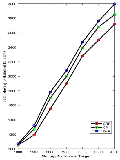 Figure 7 shows the relationship between the moving distance of the target when it increases from 1000 m to 4000 m and the total moving distance of 20 cameras when the visual range is set to 25 m. It shows that the total moving distance of the cameras increases as the distance of the target increases. This is an intuitive conclusion: as the target moves into the area, more cameras will be activated in order to keep it under surveillance. Therefore, the total moving distance of cameras will increase as well. However, as shown in Figure 7, our proposed CRP tracking approach is more efficient than the CR and Wait algorithms due to its ability to schedule the cameras in advance. For example, when the moving distance of the target was 4000 m, the CRP protocol recorded 2720 m, the CR protocol recorded 2850 m, and the Wait protocol recorded 2999 m. This means that the CRP protocol reduces the total moving distance by 4.6% compared with the CR protocol and by 9.2% compared with the Wait protocol.