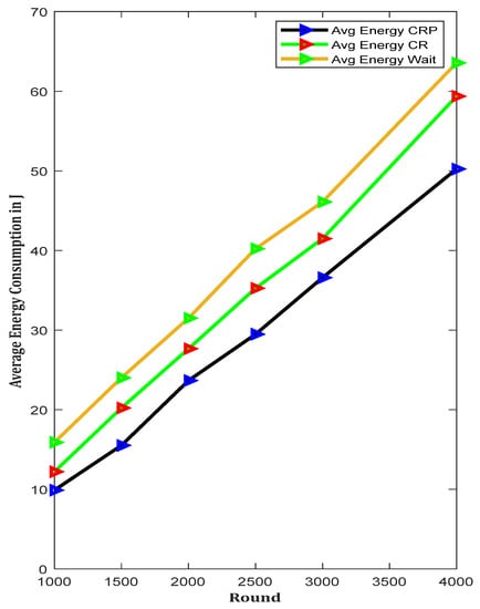 Figure 9 compares our CRP prediction approach in terms of energy consumption with the CR and Wait algorithms. In this experiment, the number of cameras is 20, the distance moved by the target is 3000 m, and the camera’s visual range is 25 m. As shown in the figure, the CRP approach gives better energy savings due to the active-sleep schedule and the advanced path prediction. As shown in the figure, at round 4000, the energy consumed by all camera sensors is 50.23 joules, while it is 59.37 joules in the CR approach and 63.59 joules in the case of the Wait protocol. This means the CRP approach achieves a 13.36% reduction in the consumed energy compared with the CR approach and a 21% reduction compared with the Wait approach.