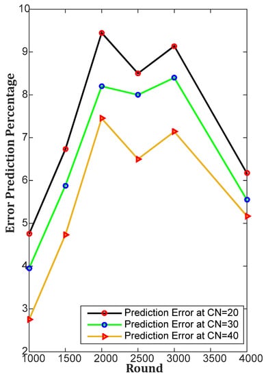 Figure 10 shows the prediction error percentage versus round for the proposed approach when the camera number is [20, 30, and 40]. The distance traveled by the target is 4000 m, and the camera’s visual range is 30 m. The prediction error percentage is calculated as the number of failed predictions over the total number of steps with respect to the number of cameras that were activated in each round. The figure shows the error percentage in each round, and these errors are independent of each other, which means that there is no relationship between the rounds and the values related to the movement log and the correctness of the prediction. However, it can be observed that the error percentage in every round is significantly smaller compared to the overall prediction moves, and its values are limited between 2.7% and 9.5%.