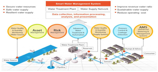 Due to the ageing of infrastructure and population expansion, improving sustainable water management is a crucial and increasingly important issue [1]. By 2050, food expectancy is estimated to double due to the increase in world’s population, which might exceed 9 billion people [2]. Insufficient water or inadequate water management systems will significantly constrain the increase in food production. In particular, droughts, erosions, and other climate culminations are worsening water scarcity. To address these challenges, various research and development activities affiliated with global research institutions embarking new solutions supported by more rational management were recently conducted to canvass different technological areas [3,4,5]. Currently, besides from Goal 6 “Clean Water and Sanitation” of UN SDGs of the 2030 agenda for sustainable development [6], water is involved in various sustainability targets and is essential in achieving a majority of other SDGs, such as poverty reduction, food production, healthier lifestyles, economic growth, and environmental sustainability. Sustainable water usage is also fundamental to combat climate change [7].