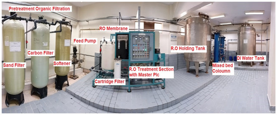 The main underground reservoir of the pilot water purification plant (Figure 3) had a total storage capacity of 60,000 gallons, while its production capacity was 2800 LPH. The plant used 35,000 gallons of city lake water each day, of which approximately 30,000 gallons were treated and used each day to produce a variety of medical goods, namely syrups and pills, and in the sanitization of machine apparatus. Table 1 presents the plant’s operational capacity.