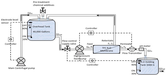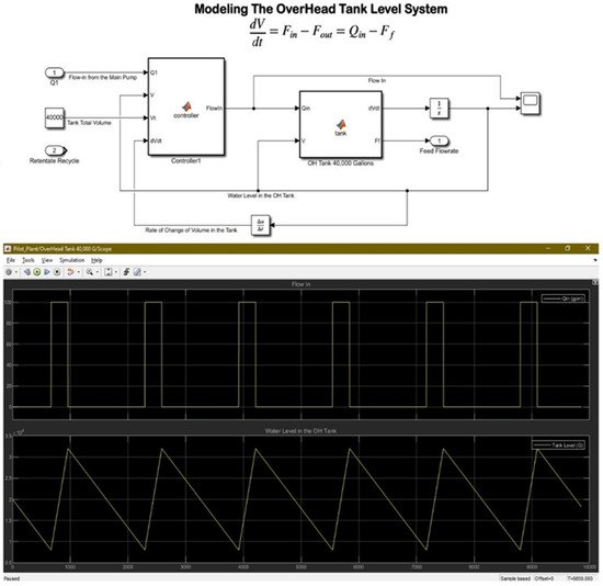 The simulation model for the RO section of a complete pilot water treatment plant is illustrated conceptually in Figure 4 and examined in this section for process analysis and control optimization. The first tank model in the figure aims to simulate the operation of an overhead tank with a total capacity of 40,000 gallons and projected inflows and outflows of 100 gpm and 18 gpm, respectively, to the feed side of the membrane. An analogue electrode level sensor is programmed to automatically control the water level in the OH tank employed from the top of the reservoir, transmitting the signal through the controller to the main centrifugal pump to turn the motor supply on or off at the pre-defined liquid levels in the tank: 8000 Gallons (low-level) and 32,000 Gallons (high-level), respectively. Figure 4 contains the developed simulation model of the overhead tank level system.