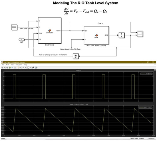 Furthermore, the system’s second tank model was designed to imitate the operation of the RO holding reservoir, which has a 3000 Gallon total capacity. This tank stores the purified water after RO treatment for additional post-treatment procedures. Thus, the rate of inflow to the RO tank is the permeate flowrate of the RO membrane, measured as 10 gpm approximately. In the same way, the analogue electrode level sensor is employed from the top to actively monitor and control the liquid level in the reservoir. Thus, the flow control supply valve is opened or closed with a delay to the hp-pump motor positioned before the RO membrane after the level sensor delivers a signal to the controller based on the pre-defined liquid levels, i.e., 900 Gallons (low-level) and 2700 Gallons (high-level). Figure 6 presents the developed simulation model of the RO holding tank level system.