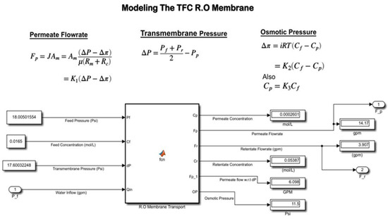 The semipermeable TFC RO membrane, for which the operational parameters and their functional capacities in the system are assessed, serves as the central component of the plant simulation model. The three waterflow pathways on the membrane are feed, permeate, and retentate. The volumetric flowrate (Fp) across the membrane was continuously monitored in the model using a flow transmitter placed at the permeate side of the membrane. As such, this turbine-type flow sensor delivers a signal to the controller based on the permeate flowrate, which controls the speed of the hp-pump motor at the feed side of the membrane. The durability and efficacy of membrane performance are significantly driven via this automated adjustment of operational parameters. The concentrated solute, on the other hand, is rejected using the membrane’s retentate cycle and returned to the overhead tank. TDS sensors are used at membrane outputs to monitor the concentration of dissolved salts. As a result, Figure 7 presents the simulation model that imitates the membrane transport process. The simulation results of the RO treatment section were examined based on the developed model for process analysis and performance enhancement via analyzing the proportionality of system’s operational parameters.