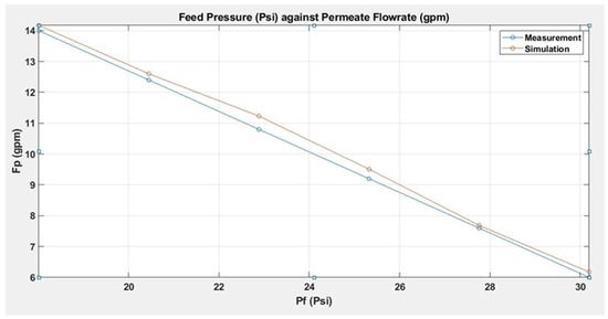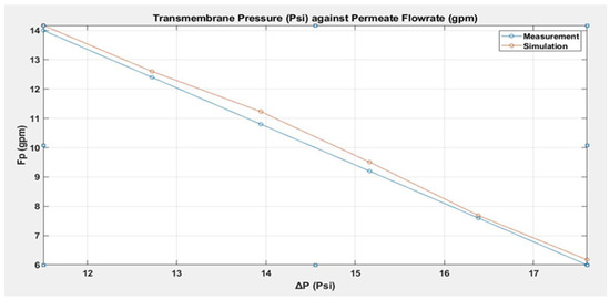 Figure 12 illustrates the drop-in flowrate at permeation (Fp) while the transmembrane pressure (ΔP) rises. Here, ΔP is the change in pressure required to force the incoming flux through to membrane pores, which can be estimated via measuring the applied pressures on both sides of membrane and plugging them into the following formula: . The obtained simulation results make it clear that both parameters in the system have an inverse correlation. Thus, the volumetric flowrate through the membrane decreased significantly as a result of a small rise in differential pressure. Here, it is vital to keep in mind that low transmembrane pressure indicates a clean and effective desalination process, whereas greater values signify degradation in membrane filtration. Correspondingly, minimum transmembrane pressure was recorded (ΔP = 11.5056 Psi) at a much greater flowrate across permeation (Fp = 13.9998 gpm); however, it increases to 17.6003 Psi with a significant drop in volumetric flowrate of 5.9997 gpm across permeation. These results are consistent with a study that exhibits an overall reduction in membrane permeability with a growth in transmembrane pressure [33,34].