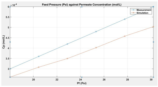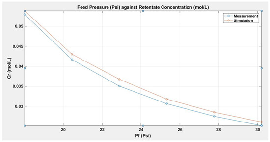 Figure 10 shows the results of decreasing concentration of dissolved salts at RO retention in opposition to the rising feed pressure. Figure 10 illustrates how the rise in feed pressure (Pf) caused a progressive decrease in the level of brine concentration at retentate (Cr). The brine content was maximum through the retentate cycle (Cr = 0.05295 mol/L) at the initial feed pressure (Pf = 18.005 Psi). However, concentration polarization developed as the process continued to treat raw water, which resulted in a gradual decrease in system efficiency. As can be seen, the initial high brine rejection through retention significantly decreased (Cr = 0.02516 mol/L), creating high pressure in the feed stream (Pf = 30.1910 Psi). This increased brine diffusion at permeation was the primary cause of slow flowrates through the RO membrane. It is clear from the results, which are consistent with the mole balance concept, that the overall applied pressure to the feed (Pf) distributed impact on both sides of the impermeable membrane, leading to substantial variations in flowrates and concentrations throughout the treatment process [31].