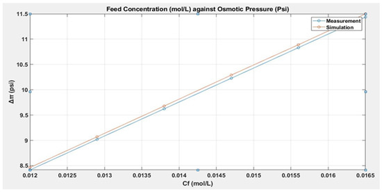 The results of the simulation in Figure 11 reveal the linear relationship among the osmotic pressure (Δπ) and the concentration of solutes in stream (Cf) that is fed to the RO unit. As such, Δπ is the required pressure applied to limit the solvent transport over membrane element and reduce the rejection of dissolved salts. In the study, the required pressure is calculated with the help of Van’t Hoff model: . The results of this test reveal that both parameters operate proportionally and develop gradually during the testing period. As can be seen from the graph, during the low solute concentration on feed side (Cf = 0.0120 mol/L), the osmotic pressure is almost half the transmembrane pressure (Δπ = 8.4151 Psi). Therefore, in order to prevent solvent from passing through the surface of the spiral wound semipermeable membrane, the osmotic pressure rises in tandem with the feed stream concentration. Similarly, an increase in osmotic pressure is observed (Δπ = 11.4360 Psi) at maximum solute concentration (Cf = 0.0165 mol/L). Thus, it can be inferred that a higher salt content streaming through the feed allows the osmotic pressure to climb to a level required for effective desalination and, thus, function as a flux inducer across the membrane. The results are consistent with research that shows that osmotic pressure rises as the molar concentration of solute particles increases [32].