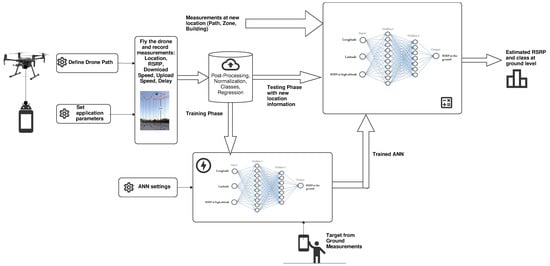 Estimating mobile signal strength using ANN and data collected by a drone was initially investigated in []. The multilayer perceptron neural network (MLP-NN) was used to generate a dense 2D map of mobile signal strength at the ground level.