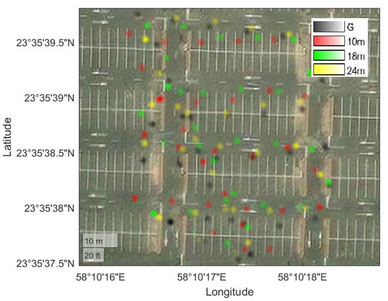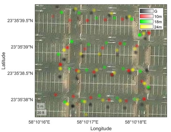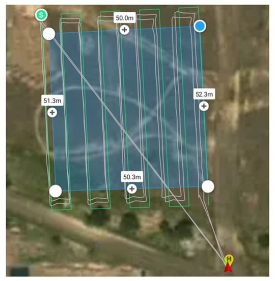 According to [], a back-and-forth pattern, which is subdivided into parallel and creeping lines, is preferable when the covered area is large and the likely target meeting point is unknown. The path followed by the drone is depicted in Figure 3. The yellow location pin indicates the takeoff and return points of the drone. The blue and white circles indicate the selected targeted area, which is approximately 50 × 52 m2 in size. The green circle is the point where the drone starts flying in the target area. The white lines show the path pattern followed by the drone at the three altitudes. The drone was programmed to travel at 1 m/s throughout the designated area. This speed was found to be the best option to allow the application to take as many readings as possible. On average, the drone required about five minutes to collect the data. This period could be changed depending on the size of the covered zone. However, the majority of the zones are about 50 × 50 m2 in size. The period of the process was kept to a minimum because our approach was used to compensate or make up for the time spent performing drive/walk tests. To optimize the efficiency and precision of the system, changes could easily be made to the drone’s speed, the size of the areas, and the interval between drone data acquisitions.