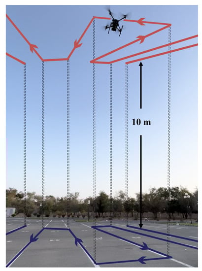 Identifiable objects were positioned at specific locations along the drone’s path used to collect signal strength measurements. The signal strength was also collected at these locations on the ground using the same application settings. Figure 4 depicts the path of the drone and the corresponding path on the ground.