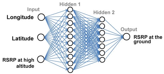 An ANN module is conventionally composed of a number of layers [], including one input layer, an output layer, and one or more hidden layers. In this work, the inputs to the ANN module were the longitude and latitude location of the measurements and the signal strength measured at high altitudes (in dBm). Measurements were conducted at various heights in order to analyze the effects of altitude on the prediction accuracy and to determine the optimal height. The output of the ANN was the predicted ground-level RSRP. The collected data were separated into three sets. The training set (70%) was used to train the ANN, the validation set (20%) was used to prevent overfitting, and the test set (10%) was used to evaluate the performance of the trained ANN. The test set, which was entirely distinct from the training set, was randomly selected from the entire dataset. The number of iterations (epochs) used to train the ANN was set to 500. Mean square error (MSE) is frequently used to evaluate the performance of a trained model for the regression problem and is expressed as