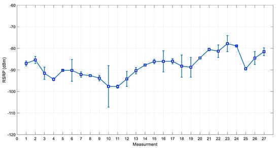 Amorim et al. [] used an LTE scanner attached to a drone to measure mobile signal strength. The authors found that the propagation environment is significantly different for airborne UAVs and ground-level users. To account for the dependence on the height/altitude, they proposed a modified a height-dependent alpha-beta (AB) model []. The reference signal received power (RSRP) was utilized to indicate the signal strength in a specific area and estimate the network coverage area. Nekrasov et al. [] employed various techniques to collect RSRP readings. Using an application on a mobile phone attached to a drone at various altitudes was one such technique. The authors found a poor correlation between measurements collected by a drone and those collected on the ground. In terms of signal strength, they categorized the RSRP into five classes ranging from excellent to poor. The results demonstrated that the data collected by the drone were 72% more accurate compared to the data collected on the ground.