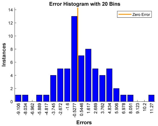 Then, we attempted to estimate the signal strength along the same path but at distinct locations. These distinct points that were used for testing were different from the points that were used for training and had not been seen by the neural network. The same proportion of data was divided into three groups as before. In this case, the only input to ANN was the location points (longitude and latitude), and the estimated RSRP was the output. To easily visualize the signal quality at a particular location, we plotted a map displaying the predicted RSRP after training (see Figure 8). According to Table 1, green points indicate excellent coverage, while yellow points indicate good coverage. The predicted RSRP is shown in Figure 9, including the error bar showing less scattering in most locations and indicating a good prediction performance. Alternatively, the error histogram in Figure 10 reveals that the majority of predicted RSRP are close to actual measurements. The horizontal coordinate represents the MSE error for the testing test, and the vertical coordinate (instances) represents the number of samples from the dataset. The average percentage of error was determined to be 3.7%.