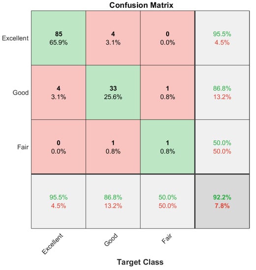 In this classification method, the target output is the predicted class of the test data’s signal strength, as stated in Table 1. The input to the neural network was only the location (longitude and latitude), and the output was the estimated class. The data were divided into three groups in proportions of 70:10:20 for training, validation, and testing, respectively. The measurements were found to only include 3 ranges of classes (excellent, good, and fair); there were no poor signals found, and therefore, the NN did not predict the class ‘Poor’ for any output. However, the results of the classification algorithm showed an accuracy of 92.2%. The confusion matrix shown in Figure 11 depicts the percentage of the prediction performance of the classifier. The green squares indicate the correct predictions for each class, and the red squares indicate the wrong predictions. For example, in the first green square, 85 test measurements of the ‘excellent’ class were predicted correctly, with 65.9% overall accuracy. The bottom squares represent the accuracy and the error prediction of each class. For the ‘good’ class, the NN successfully predicted 86.8% of signals that fell into this signal strength category and failed to predict the other 13.2%.