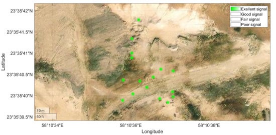 A drone is a remotely piloted flying robot that follows a predetermined flight path. Drones are able to cover large geographic areas that traditional drive or walk tests cannot []. They can be used to assess signal strength in rural and urban areas at higher altitude and to transmit collected data to a processing center to check the service quality of the signal []. The DJI Matrice 200 V2 quadcopter was used in this study. It is a high-quality commercial drone. The Matrice 200 V2 has 17-inch propellers that are attached to powerful motors to ensure stable flight, even in strong winds. Moreover, it has a dual-battery setup for longer flight time. Due to its adaptability and durability, it has been used in various applications. The drone weighs 3.8 kg and has a maximum payload of 2.3 kg and a maximum flight time of 24 min. Its flight maximum range is 7 km. An off-the-shelf smartphone was used to record the signal strength and GPS coordinates. The smartphone was equipped with an application that can read a variety of mobile network parameters. G-NetTrack, a driving test and network monitor application for 2G, 3G, and 4G networks able to detect multiple LTE channels, served as the mobile receiver in cases where there was no LTE network connection. The measured parameters were logged during the test time and kept in a file for post-processing. The smartphone was mounted on the drone, and the application was configured to measure the signal strength, network delay, and upload and download data speeds, along with the location information. In this work, we used only the signal strength and location information for prediction. Before each flight, the application was set to start recording manually and measure new reading sets of parameters every second. This could be changed in the application settings to record more readings in smaller areas. The drone’s altitude remained constant throughout each flight to estimate signal strength on the ground using data recorded at high altitudes. The desired height was measured relative to the ground at the point of takeoff. Using the drone controller, the altitude was fixed to a certain height, and with autopilot mode, the drone had such high stability that it could fly horizontally along the path. The drone maintained constant altitudes (10 m, 18 m, and 24 m) throughout its different flights.