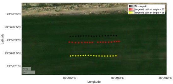All previous scenarios predicted the signal strength of the same location point on the ground relative to the signal strength at a high altitude. Due to obstacles such as trees, mountains, or other obstructions, it is sometimes impossible to conduct a drone or drive test to measure signal strength at high altitudes or on the ground along the target path. Therefore, it serves the same purpose to fly the drone at an angle. In this scenario, we explore the possibilities for predicting the signal strength from a drone at a specific angle. To examine the effect of different angles on signal strength prediction, the height of the drone was fixed at 10 m. Location and RSRP data collected at 10 m altitude were inputs to the ANN, and the output was the RSRP on the ground at an angle with respect to the vertical. Figure 15 depicts the flight path of the drone and the predicted RSRP on the ground at an angle of 32 degrees and 68 degrees from the drone. The percentage MSE was determined to be 2.3% for angles closer to the drone and 2.6% for those further away. Overall, it appears that both cases accurately predict signal strength on the ground.