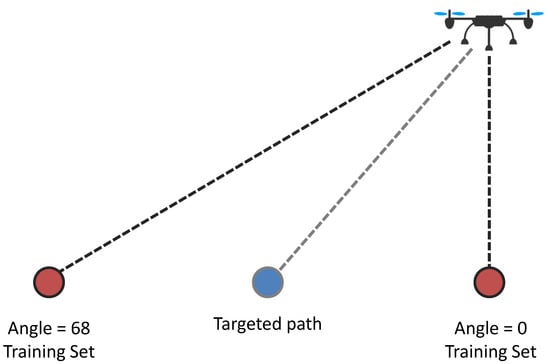 The neural network could also predict the signal strength of a path with a previously unseen angle and measurements of another different angle. In this instance, the neural network structure included the angle value as an input. The training set consisted of the data for the path directly beneath the drone (angle = 0) and the path within an angle (68° in the tested scenario) from the drone. The test set consisted of a path between these two ground-level angles. Figure 16 depicts the system’s outline. The red points represent the routes included in the network’s training set. The blue point represents the predicted target RSS of the path between two red points. The percentage MSE was determined to be 1.58%. Hence, it is possible to use the trained ANN to predict the signal strength on the ground with different angles from the drone, which can be useful if there are difficulties measuring the signal strength due to the drone’s limits or restrictions regarding the location. Table 3 displays a sample of the test outcomes.
