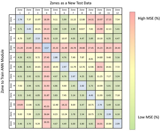 Although it is theoretically possible to determine the strength of an electromagnetic field at any given location in space using the Maxwell equations, the amount of data and level of precision required make it practically impossible. The signal strength was predicted with the aid of a model that simplified the calculations. There are many available models for this, such as the Okumura–Hata and COST models. To predict the signal strength or the path loss, these models require distinct types of environments and operational information, such as frequency of operation, Tx and Rx antenna parameters, TX–RX distance, and type of clutter. On the other hand, the method used in this work requires location information and a trained ANN module. Twelve trained ANN modules were developed for the twelve tested campus zones. These trained modules were used to test newly collected data from other zones without retraining the network. To accomplish this, we considered the collected measurement for each zone to be a new piece of information for each trained ANN module. In total, eleven new measurements were attempted on each module. While it is impossible to predict signal strength with absolute certainty, the results indicate that the average error was minimized when the training zone was close to the test zone (for example, zone 1 and zone 2) and/or the RSRP ranges of the two zones are comparable. Overall, this method could be enhanced by including additional input data, such as the transmitted power from the base station or the path loss. Figure 19 depicts the MSE prediction error matrix after testing the trained ANN module with new data from other locations for all zones. The blue squares indicate that each zone is evaluated using its own test data. The green squares indicate good predictions with lower MSEs based on the results of the predicted RSRPs and how closely they match the actual RSRP. It was expected to have an MSE of less than 7%. Yellow squares indicate an acceptable prediction range of 7% to 15% MSE. Red squares represent poor predictions, with an MSE greater than 15%. As depicted in the figure, the module trained on zone 7 data provided the most accurate prediction for all other zones tested on campus. Consequently, it can serve as a default model for predicting the signal strength inside the university using a drone. The model trained on zone 4 cannot be used as the default model because it predicts the weakest signal strength for all campus test data. This is believed to be due to the fact that zone 4 was close to the base station antenna, with strong signals and less variability.