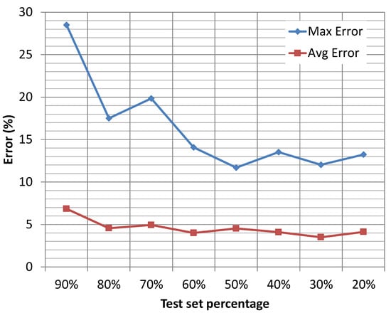 Drones in general have short battery life, and on the other hand, there is a need to reduce the effort put forth while taking field measurements. It is essential to specify the minimum percentage of the training class that would show acceptable results. Here, we examined the impact of reducing the training set’s size on the accuracy of the signal estimation. Instead of using the default division of 70:20:10 for training:validating:testing, different division values were tried for these classes. The chart in Figure 20 shows the average and the maximum error for using different values for the testing set, ranging from 90% until 20%. The error increases as the size of the testing set grows, as expected. However, the average error drops to less than 5% when testing with less than 80% of the data.