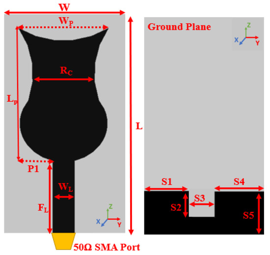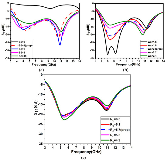 A comprehensive parametric analysis is used to determine the ideal values of the antenna parameters. In the first stage, the ground plane of the antenna (S5) is lowered in a sequential manner from 10 mm to 8 mm with a step of 2 mm. The antenna’s reduced ground plane changes the uniform current distribution and decreases the quality factor, which enhances the impedance bandwidth. The change in the value of the S5 and its impact is illustrated in Figure 5a. The width of the feedline (WL) varies from 1.6 mm to 2.4 mm with a step of 0.2 mm. The value of the WL 1.6 mm provides below −10 dB operating frequency on the lower side; however, at a higher frequency, S11 is above −10 dB, as depicted in Figure 5b. The linear increase in the WL with 0.2 mm improves the impedance bandwidth in a wider frequency range, and the optimal value of the WL is 2 mm. Similarly, the radiator width (Rc) varies from 4.9 mm to 6.3 mm with a step of 0.4 mm. The variation in Rc has a smaller influence on the S11 curve. The value of Rc is selected as 5.7 mm for the optimal operation of the antenna.