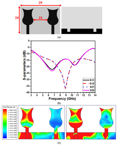 A two-port UWB antenna is built by reproducing the proposed single-element antenna horizontally with a spacing of 0.16 λ. The overall dimension of the proposed two-port antenna is 20 × 29 × 1.6 mm3 and a redesigned ground plane to decrease mutual coupling. Figure 3 depicts the two-port antenna without DGS and its reflection and transmission coefficients curve. The S-parameters curve shows that the antenna functions from 4 to 12.2 GHz, although field coupling among the antenna’s inert ports is significant, especially at lower and higher frequencies. The strong mutual coupling between the ports is even witnessed through the surface current distribution plot of the proposed antenna at the resonating frequency of 6.5 GHz and 10.5 GHz, as depicted in Figure 3c.