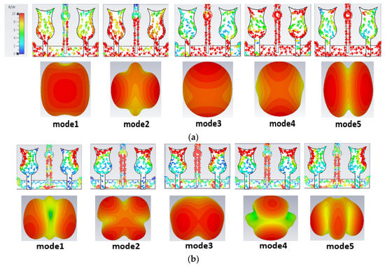 Current distribution and far-field pattern at various modes at (a) 6.4 GHz and (b) 11.9 GHz.