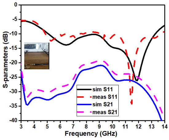 The developed two-port UWB antenna is measured using an Agilent N5247A vector network analyzer. The impedance bandwidth of the proposed antenna is from 5 to 13.5 GHz. The DGS, as a decoupling structure, is used for enhancing isolation among the inter ports of the proposed antenna. Across the antenna’s operating frequency, isolation is better than 21 dB in both simulated and measured scenarios. The S-parameters of the proposed antenna are illustrated in Figure 9.