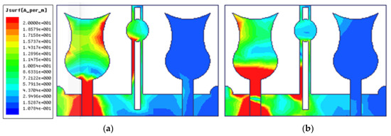 Surface current distribution plot: (a) 6.4 GHz and (b) 11.9 GHz.