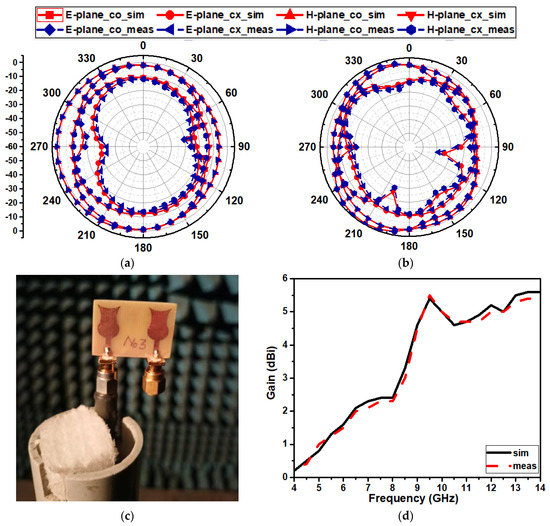 At the resonant frequencies, 6.4 GHz and 11.9 GHz, a two-dimensional radiation pattern of the proposed antenna is plotted in XZ and YZ planes, as represented in Figure 11. The co and cross radiation pattern at the E and H planes is measured by exciting one port and terminating the other with the matched load at 50 Ω. The simulated and measured radiation pattern at the two principal planes, E and H, correspondingly demonstrates the quasi-bidirectional and omnidirectional. The simulated and measured gain of the antenna against the frequency is depicted in Figure 11d. The maximum and minimum gain of the antenna is 5.5 dBi, and 0.4 dBi is observed at frequencies of 9.5 GHz and 4.5 GHz.