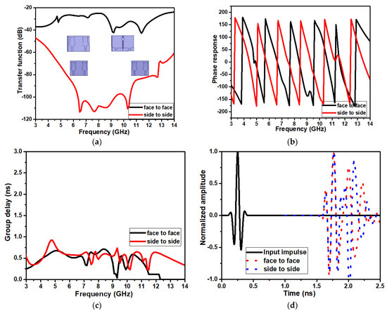 The proposed two-port UWB antenna is configured in face-to-face and side-to-side arrangement with a separation of 100 mm to perform time domain features, such as transfer function, phase response, group delay (GD), and fidelity factor (FF). The transfer function describes the amount of correlation among the antenna elements in MIMO. The phase response illustrates the phase linearity in the transceiver system. The transfer function and phase response of the proposed antenna are illustrated in Figure 13a,b. The figure shows that the transfer function is better than −25 dB, and the phase is linear across the antenna’s operating frequency. The GD of the antenna depicts the phase variation in concordance with the angular frequency, as shown in Equation (11). The FF describes the synchronization of the shape of the output and input signal, not the signal’s amplitude. The FF helps to realize the faithful reproduction of the signal at the receiver and is computed using Equations (12)–(14). The GD and FF of the proposed antenna are less than 1 ns and better than 0.9, respectively, as shown in Figure 13c,d.