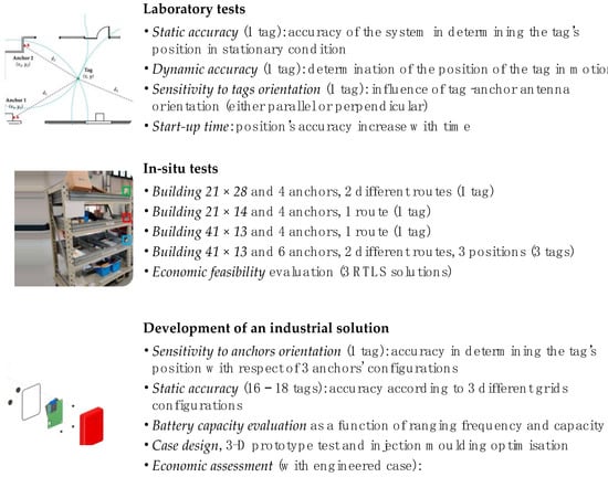 As far as static accuracy is concerned, results from the experiments returned positive and promising results, and the same goes for dynamic accuracy; the tag’s orientation (i.e., perpendicular versus parallel) turned out to be neglectable, while the start-up time error as well returned satisfying results. According to that, once the system was preliminary positively evaluated and validated, the tests moved to the physical warehouse, where the best position and number of the anchors were determined; clearly, the resulting configuration is suitable for that specific case study and for the warehouse of the company under investigation. For the detail of these test campaigns and their results, see, once again, [
