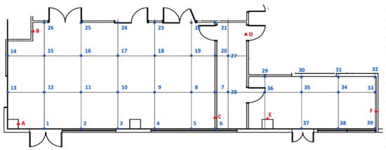 Figure 2 was used with the exception of some points not considered due to the fact that the tested tags were in a lower number than the number of reference points. However, points were identified in such a way as to ensure that relevant positions (e.g., center of the room, wall proximity) were tested.