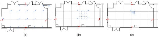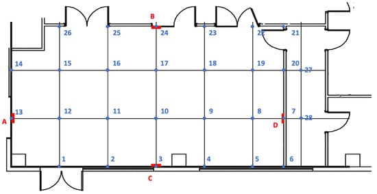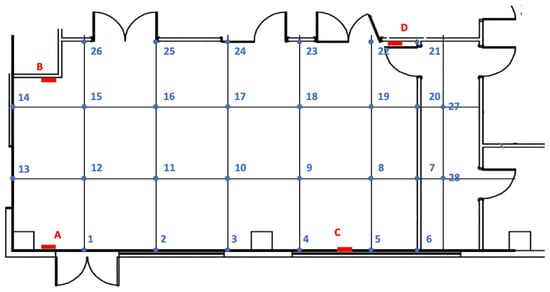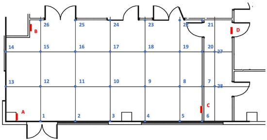 Figure 2 proposes the plan of the area, showing the measuring points. Note that as happened in the tests carried out last year, since the main goal is to assess the best anchors configuration, the second room was intentionally excluded from subsequent experimentations; hence, the testing campaign was limited to the main room (points 1 to 26 for the main room, plus 27–28 for the corridor).